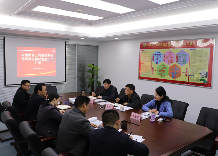 3月6日,集团公司党委委员、纪委书记宋志华一行莅临安建财务督查公司春节期间作风建设工作情况。集团公司人力资源部副主任朱金蓉,党委工作部主管章志胜陪同。安建财务公司领导班子成员及党群工作部、综合事务部相关人员参加会议。