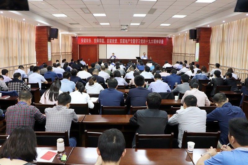 为深入学习贯彻党的十九大精神,全面实施大培训。4月20日,安建财务公司联合技师学院、安建投资、安建地产三家单位共同举办学习党的十九大精神专题讲座,邀请中共安徽省委党校省情研究中心主任、教授张彪进行授课。四家单位的相关领导、中层管理人员、项目班子成员、党员及业务骨干等200余人参加了讲座。此次讲座在技师学院行政楼六楼会议室举行,由安建财务党总支书记、副总经理潘琳主持。