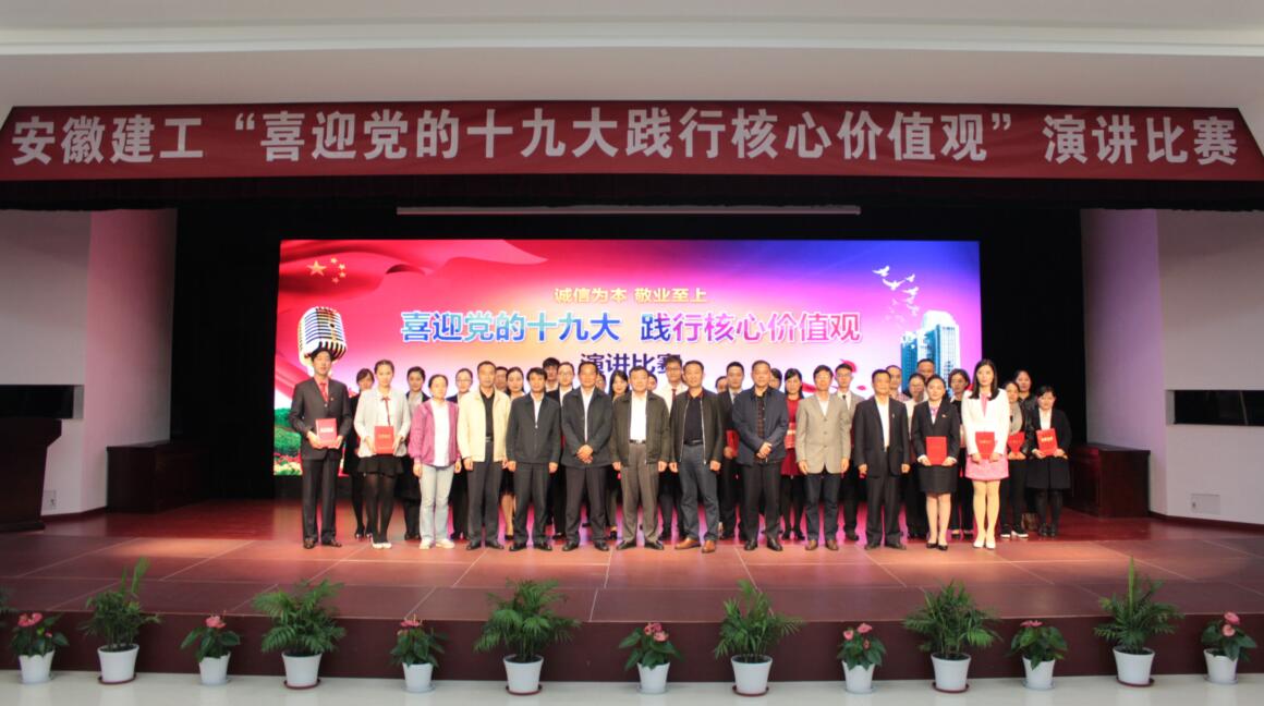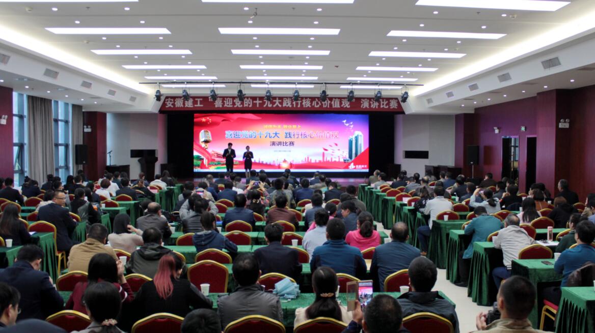 在主持人精彩的开场白之后演讲比赛正式拉开序幕,参赛选手围绕“喜迎党的十九大,践行核心价值观”这一主题,结合各自工作和生活经历,借助自己设计制作的背景短片或PPT,用真挚的情感、生动的事例,声情并茂、满怀激情地讲述了安徽建工人立足岗位,弘扬践行集团核心价值观的深切体会和感人故事,展现了身边员工于平凡中奉献青春、于艰苦中助力改革、于岗位中磨练尖兵的朴实情怀。比赛中,评委们围绕参赛选手的演讲内容、演讲技巧、演讲效果、时间控制、脱稿情况等方面进行了现场综合考评和打分,并现场宣布比赛结果;比赛结束后,领导评委嘉宾为获奖选手进行了颁奖。