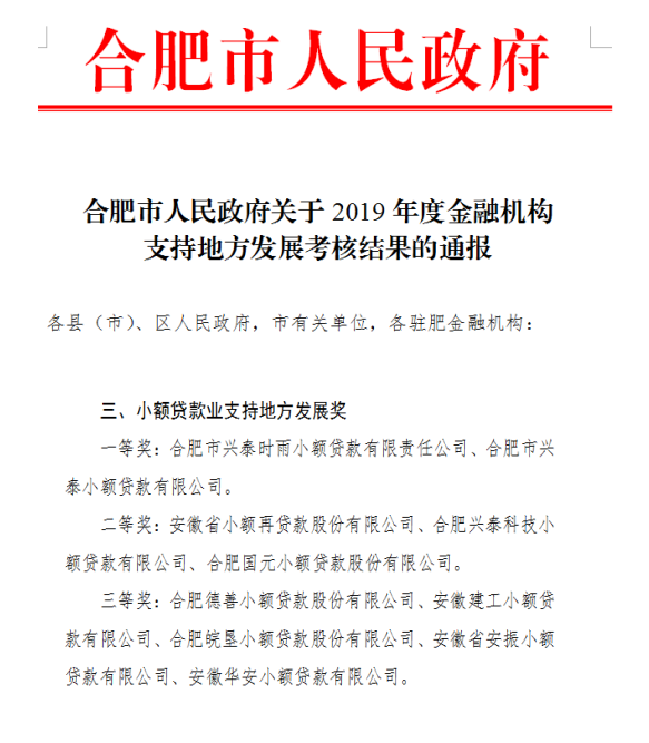 近日,《合肥市人民政府关于2019年度金融机构支持地方发展考核结果通报》中,安建小贷荣获“小额贷款业支持地方发展奖”三等奖,这也是安建小贷继前两年获得该奖后第三次获得该荣誉。