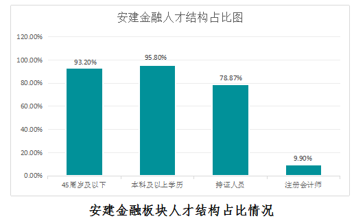 这五年,按照“党管人才”工作总要求,积极推进人才市场化布局,强化人力资源管理,按需引进高技能专业人才,完善了“引才聚才用才”竞争动力机制,构建以业绩为导向的薪酬考核体系,创造性的开展“价值观+绩效考核”综合考评方式,注重价值观由虚转实和绩效考核结果的应用,优化人才结构及配置(其中45周岁及以下占比93.2%,本科及以上学历占比95.8%,中高级及以上职(执)业资格占比53.5%,注册会计师7人,持证率达78.87%),稳定金融人才队伍,打造了一支认同建工文化、归属感强、业务本领硬、敢于担当作为的金融管理团队。