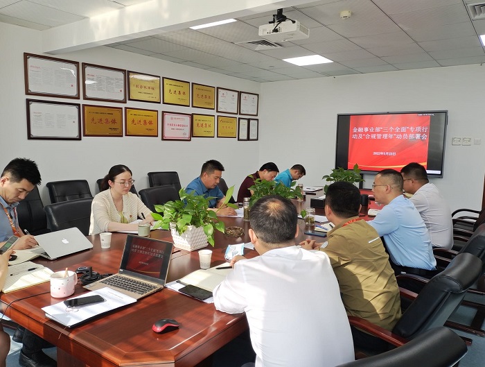 5月23日,金融事业部召开“全面清底、全面整改、全面规范”专项行动暨“合规管理建设年”动员部署会议,事业部党支部书记、总经理于忠山主持会议并讲话,各部门负责人、所管单位领导班子成员参加会议.