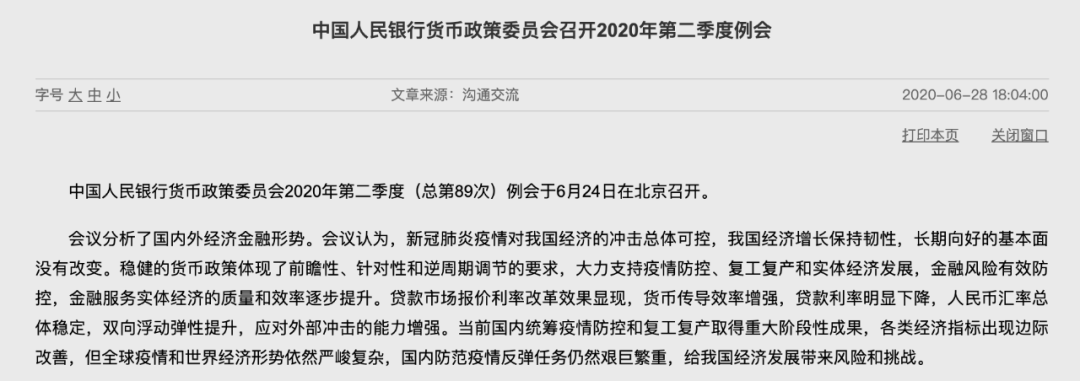 央行网站28日消息,中国人民银行货币政策委员会2020年第二季度(总第89次)例会日前在北京召开,释放出多个重磅信号!