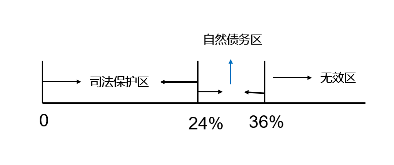该规定的主要关键数字是24%和36%,如何准确理解这两个关键数字呢?24%和36%实际上是设定了民间借贷利率的三个区间,第一个是依法受到司法保护的区间,即年利率24%以下的民间借贷依法受到法律的保护;第二个区间是不受司法保护的区间,即年利率超过36%的民间借贷,超过年利率36%的部分法院将认定无效,不受司法保护;第三个区间是自然债务区间,即年利率24%到36%之间,这个区间的债务属于自然债务,当事人自愿履行该区间的债务,法院不反对,但如果提起诉讼,要求法院保护该区间内的债务,法院不会保护。具体见下图: